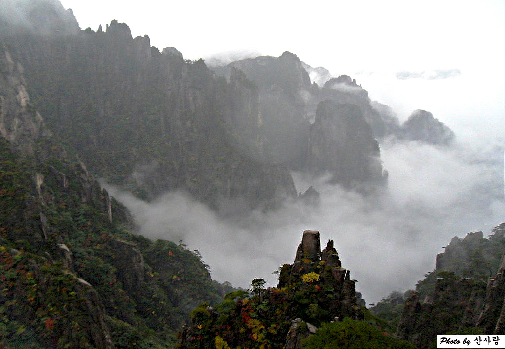 잠시 단풍으로 물들어 가는 산하를 구경하고, 5분 정도 걸어가다 보니 갑자기 운무가 사라지고 운해가 있는 가운데 괴석 위에 소나무가 자리 잡고 있는 멋진 풍광이 펼쳐져 황산을 찾은 것을 실감할 수 있었다. 시시각각 운무가 지나가면서 보여주는 황홀한 모습에 벅찬 감동을 주체하지 못하고 카메라 세트만 연신 누르다가 정신을 차리고 인증사진을 찍었다.