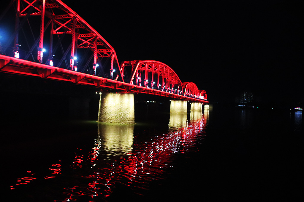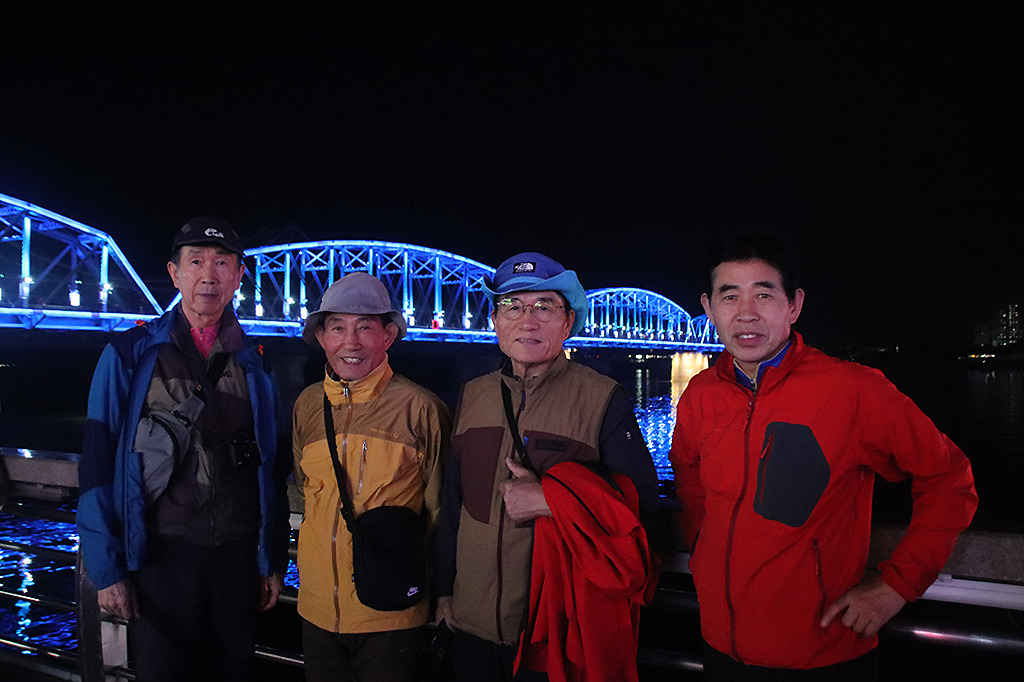 봉황산 산행을 마치고 단동으로 이동하여 숙소에 짐을 풀고 저녁식사를 한 후 단교 야경을 보러 갔다. 단교는 6 · 25 전쟁 때 미국이 중국의 전쟁 개입을 막기 위해서 절반을 파괴하여, 현재 중국 쪽 절반만 다리가 남아 있어 6 · 25 전쟁의 상흔을 확인할 수 있었다. 끊어진 다리 뒤쪽으로 북한 신의주인데 불빛이 간간히 보였다. 단교 옆의 중조우의교(中朝友谊桥) 뒤쪽이 위화도로 제법 높은 건물에서 불빛이 비치는 것을 볼 수 있었다. 위화도는 작년 여름(7월말) 압록강 유역에 쏟아진 폭우로 큰 피해를 입은 곳으로 그 후 대단위 아파트 공사가 진행되었다고 한다. 내일 압록강 유람선 투어시 자세히 볼 수 있을 것이다.