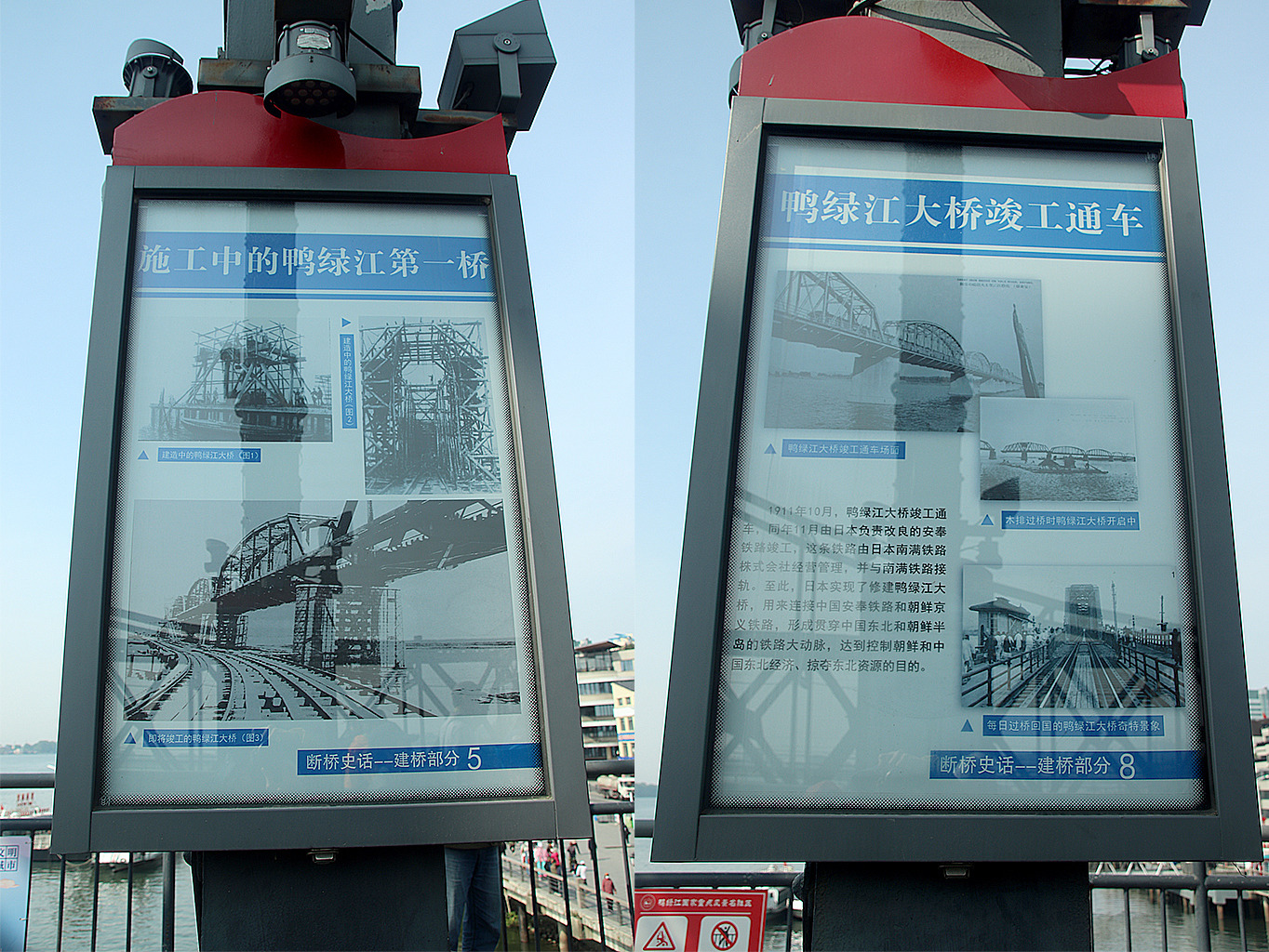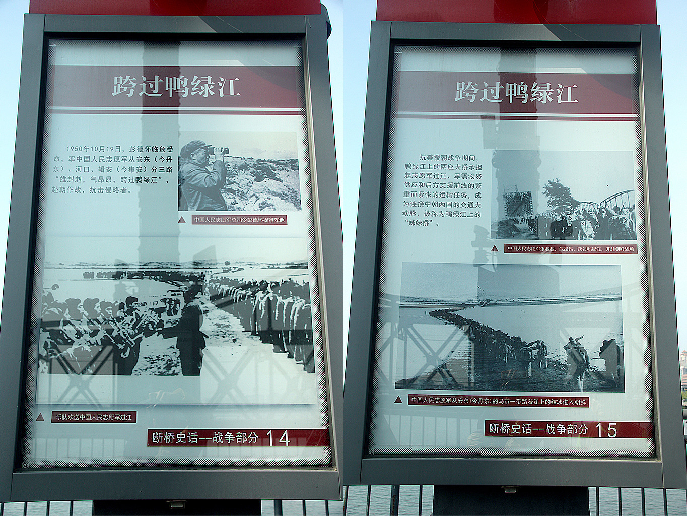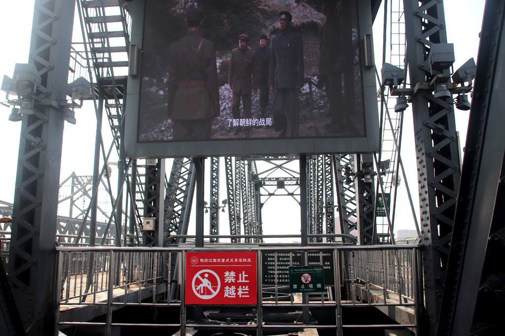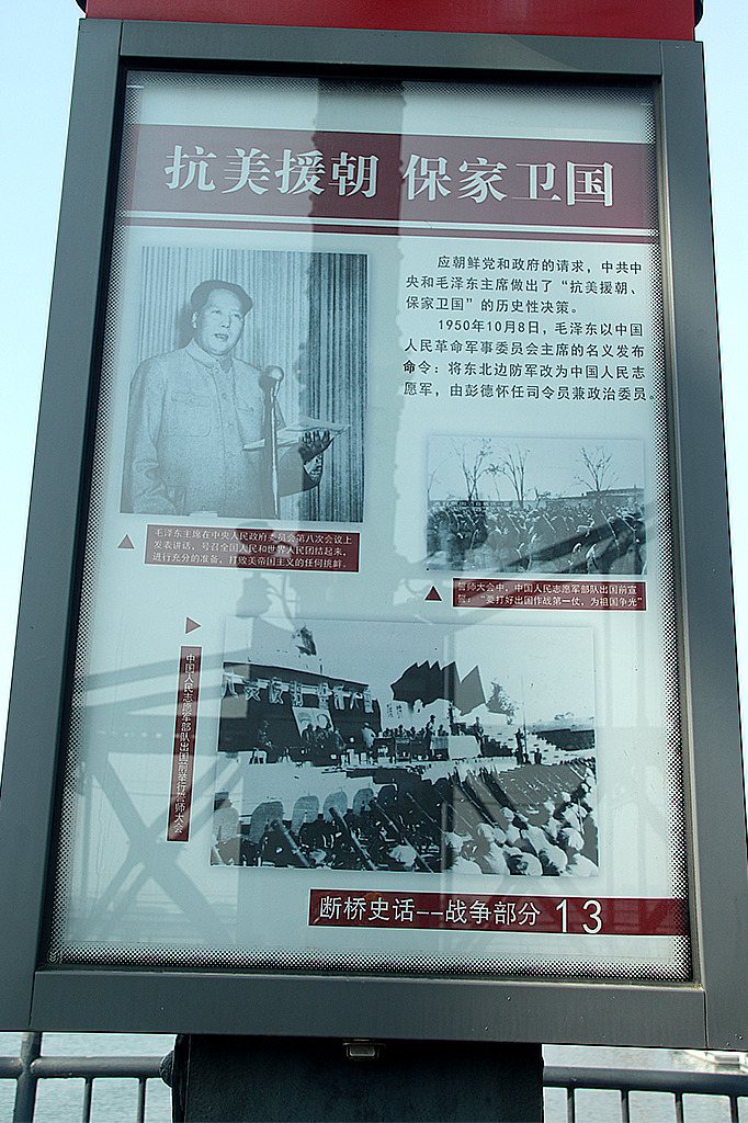 직접 단교에 올라 6 · 25 전쟁의 상흔을 확인해 보자. 다리 위에 걸어 둔 6 · 25 전쟁 사진과 설명이 눈길을 끈다. 마오쩌둥 사진 옆에 적힌 ‘抗美援朝, 保家卫国(미국에 대항하여 조선을 돕고 나라를 지켰다.)’라는 글귀에서 6 · 25 전쟁에 대한 중국인들의 인식이 우리와 얼마나 다른지 단번에 알 수 있다.
