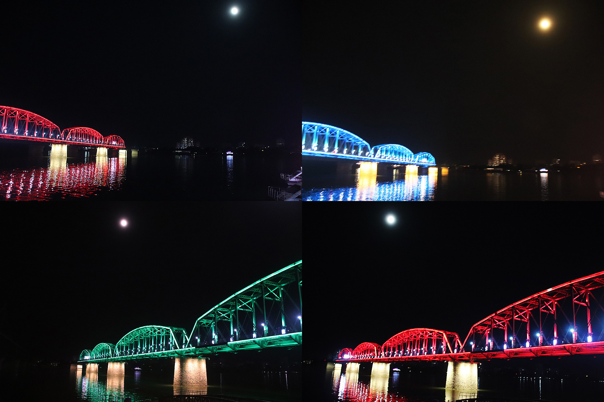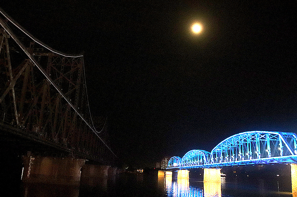 단교 옆의 중조우의교(中朝友谊桥)는 야경이 없고, 단교에만 조명이 화려하게 비추어 달무리 속에 더욱 빛이 내는 것 같은 느낌이다..