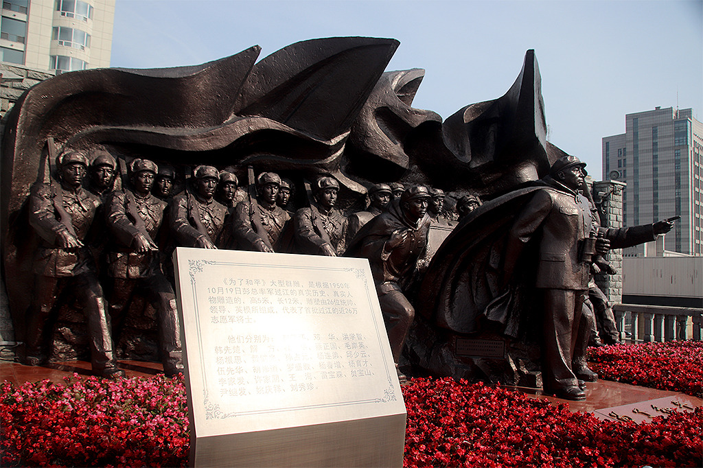 마오쩌둥 사진 옆에 적힌 ‘抗美援朝, 保家卫国(미국에 대항하여 조선을 돕고 나라를 지켰다.)’라는 글귀에서