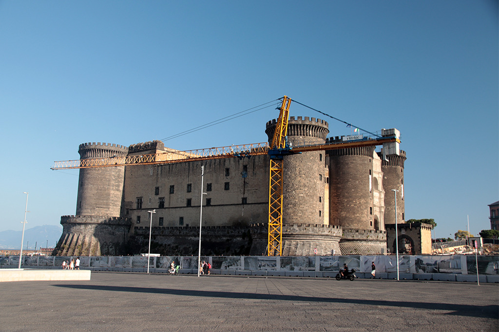 ‘새로운 성’이라는 뜻의 카스텔 누오보는 1279년 프랑스의 앙주 가문에 의해 시작되어 3년 만에 완공되었다. 나폴리만이 한눈에 내려다 보이는 전략적 위치에 있는 이 성은 처음에 왕궁과 요새로 동시에 사용되었다. 그리고 나폴리가 유럽의 문화 중심지로 발달하던 시기 지오토나 보카치오 등의 예술가, 작가들이 머물기도 했었다. 그러나 15세기 스페인의 아라곤 왕국이 앙주 가문을 무너뜨리고 이 성을 점령하게 되면서 성의 역할은 조금씩 변하기 시작했다. 특히 아라곤은 나폴리 입성을 기념하기 위해 1467년 입구에 4개의 원통 모양의 탑이 성벽을 둘러싸고 있는 르네상스 양식의 백색 대리석으로 된 거대한 단면의 개선문을 세웠다. 한편 지금은 박물관 사용되고 있다. (출처 : 네이버 지식백과)