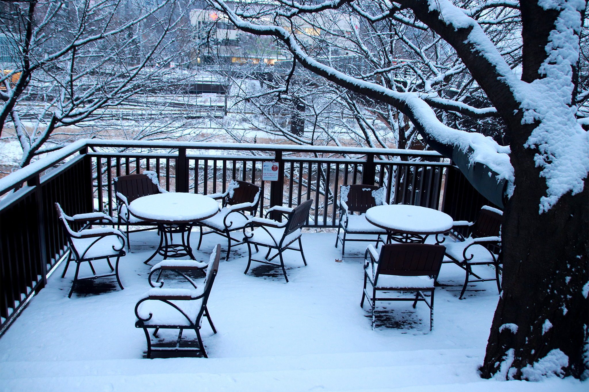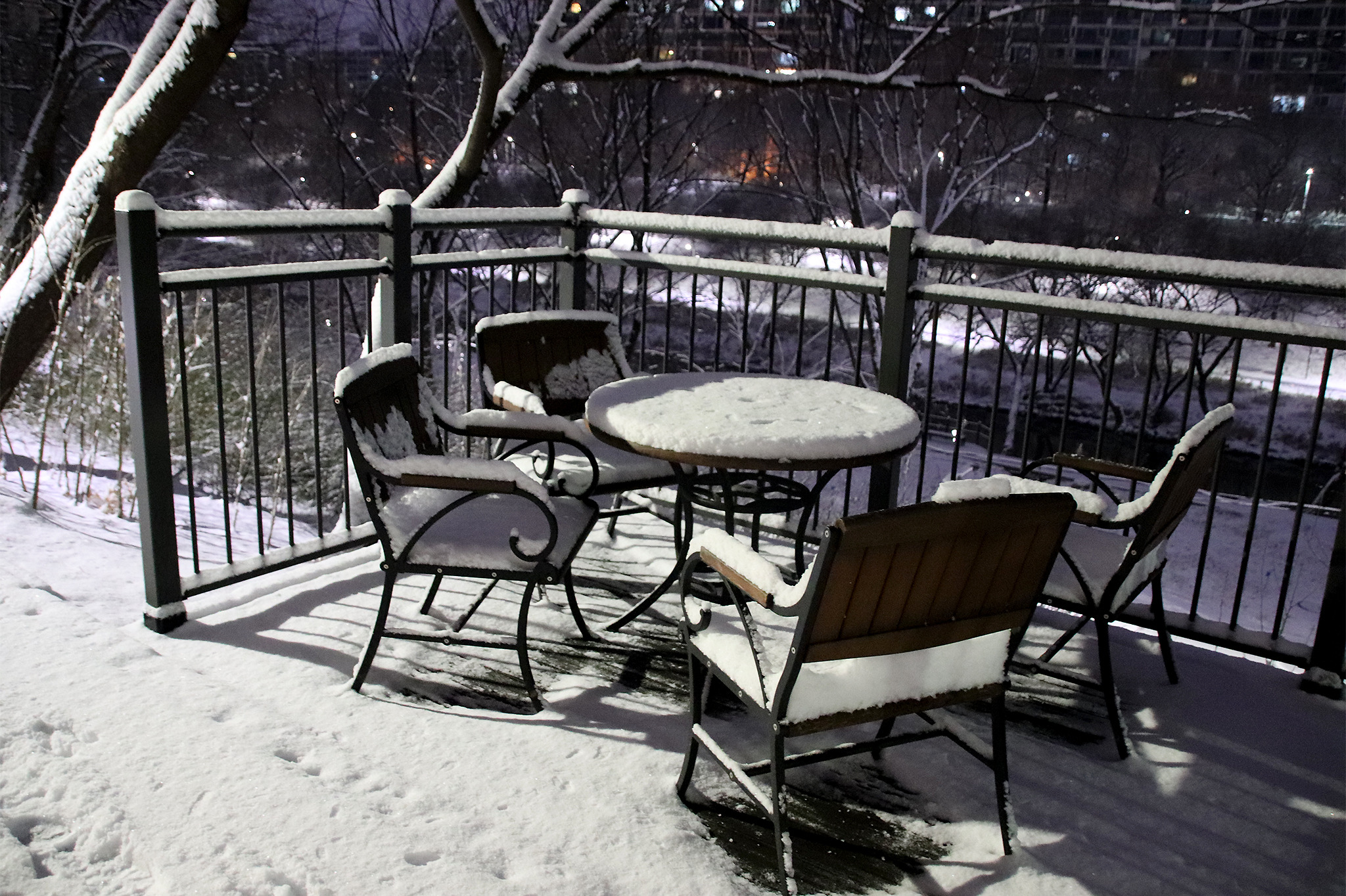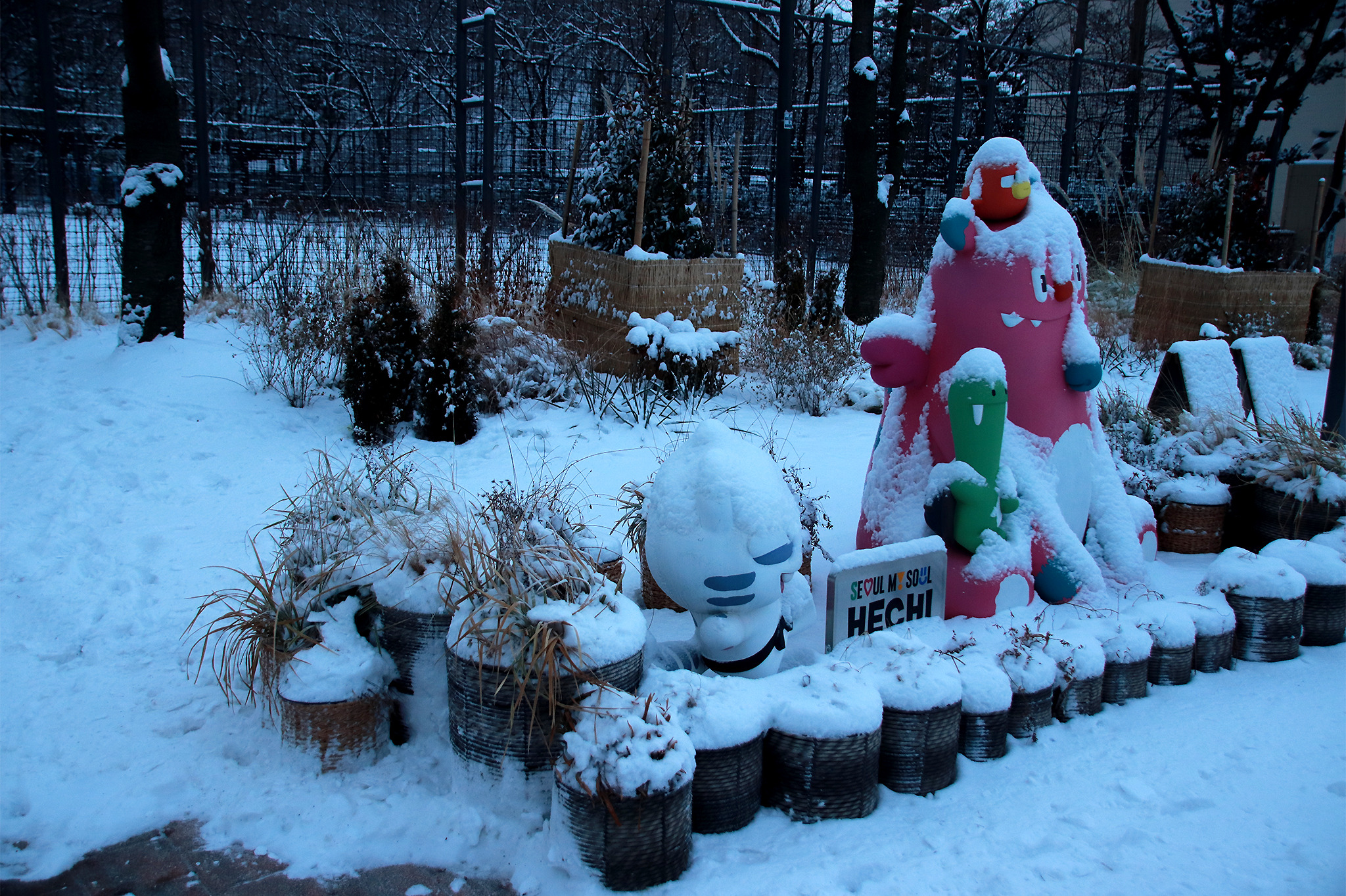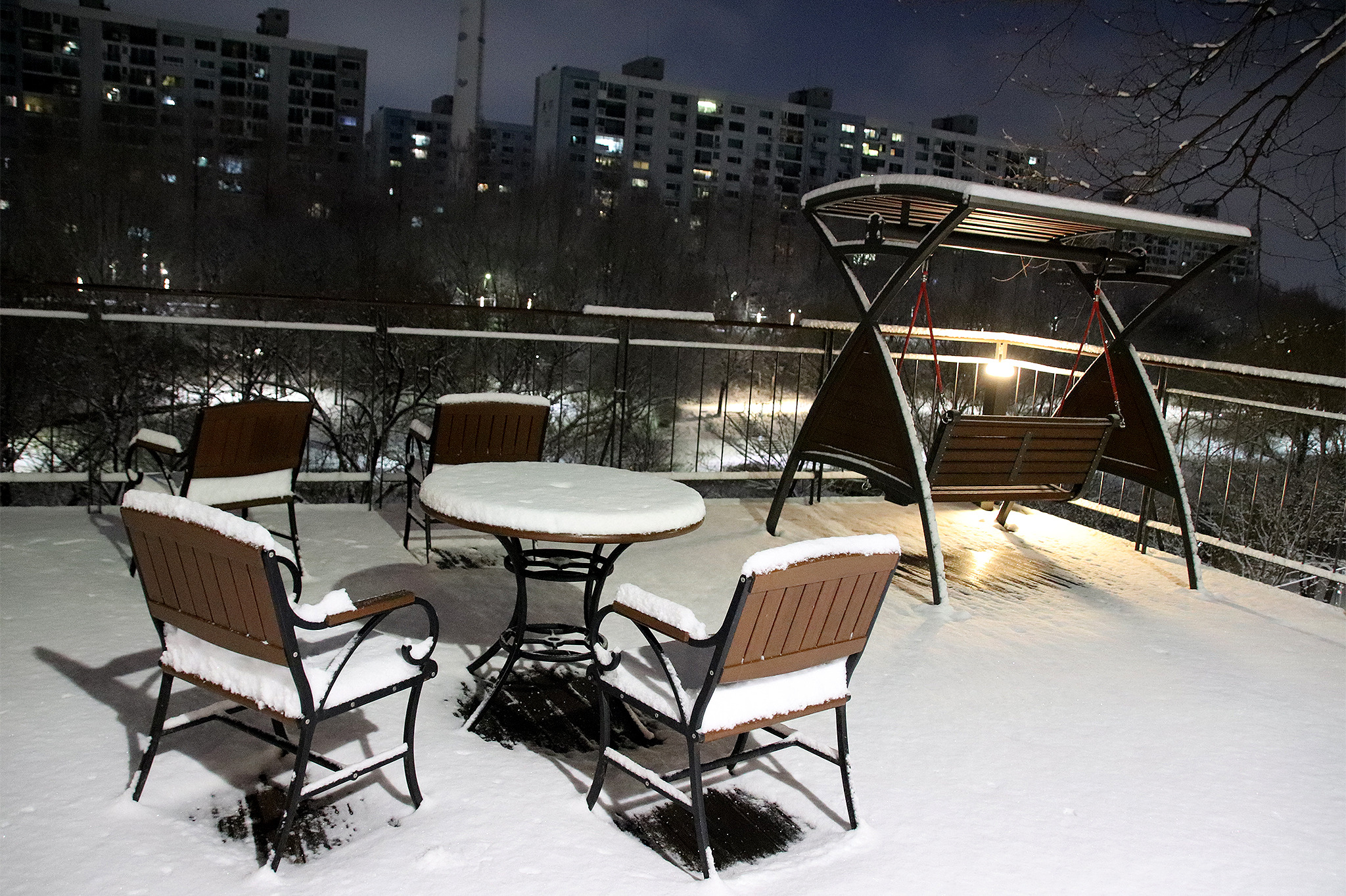 쉼터 의자에는 소복하게 눈이 쌓여 있고..