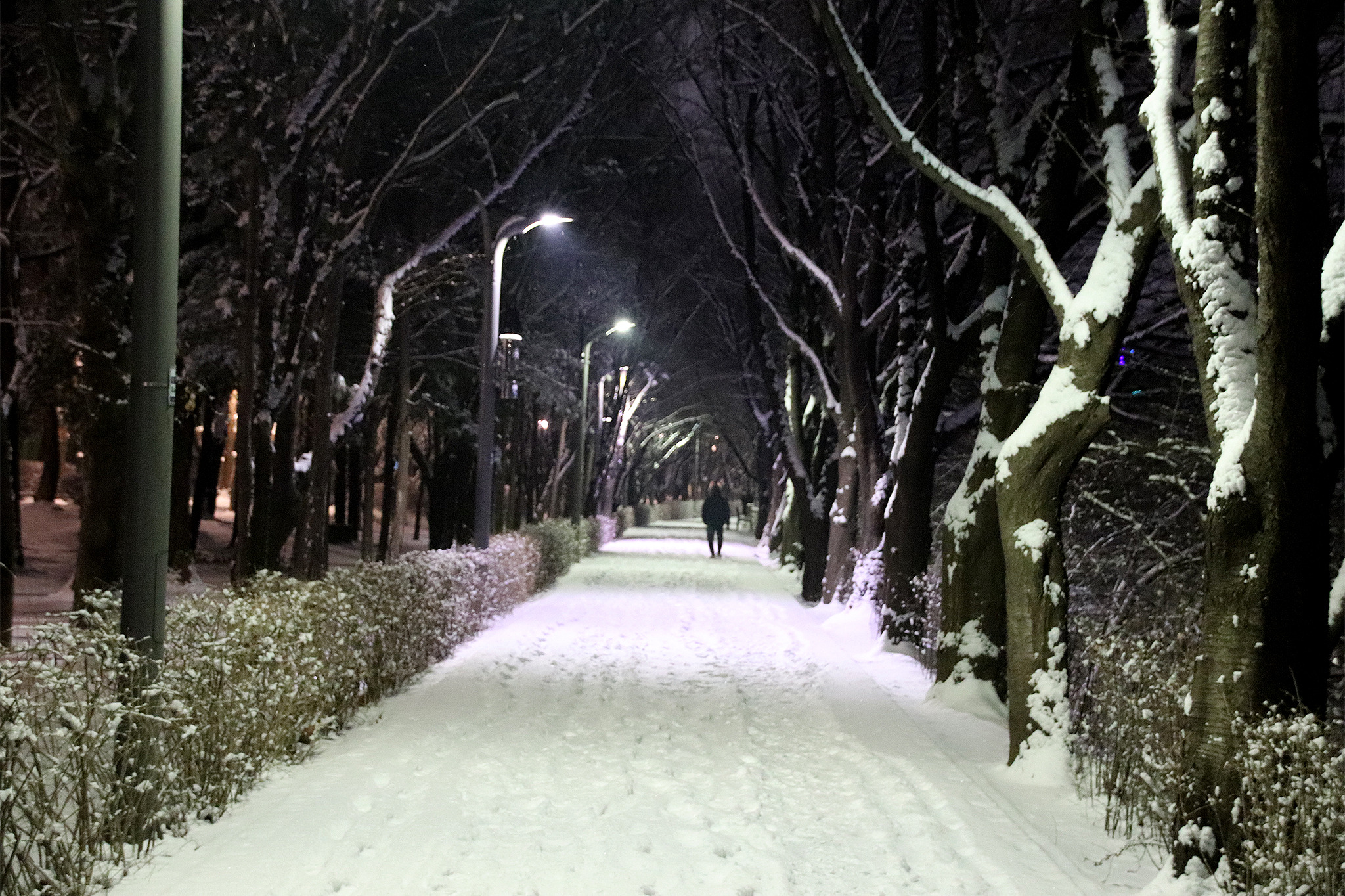 가로등에는 아직 불이 켜 있는데 땅에는 이미 다녀 간 사람들의 발자국이 남아 있고..