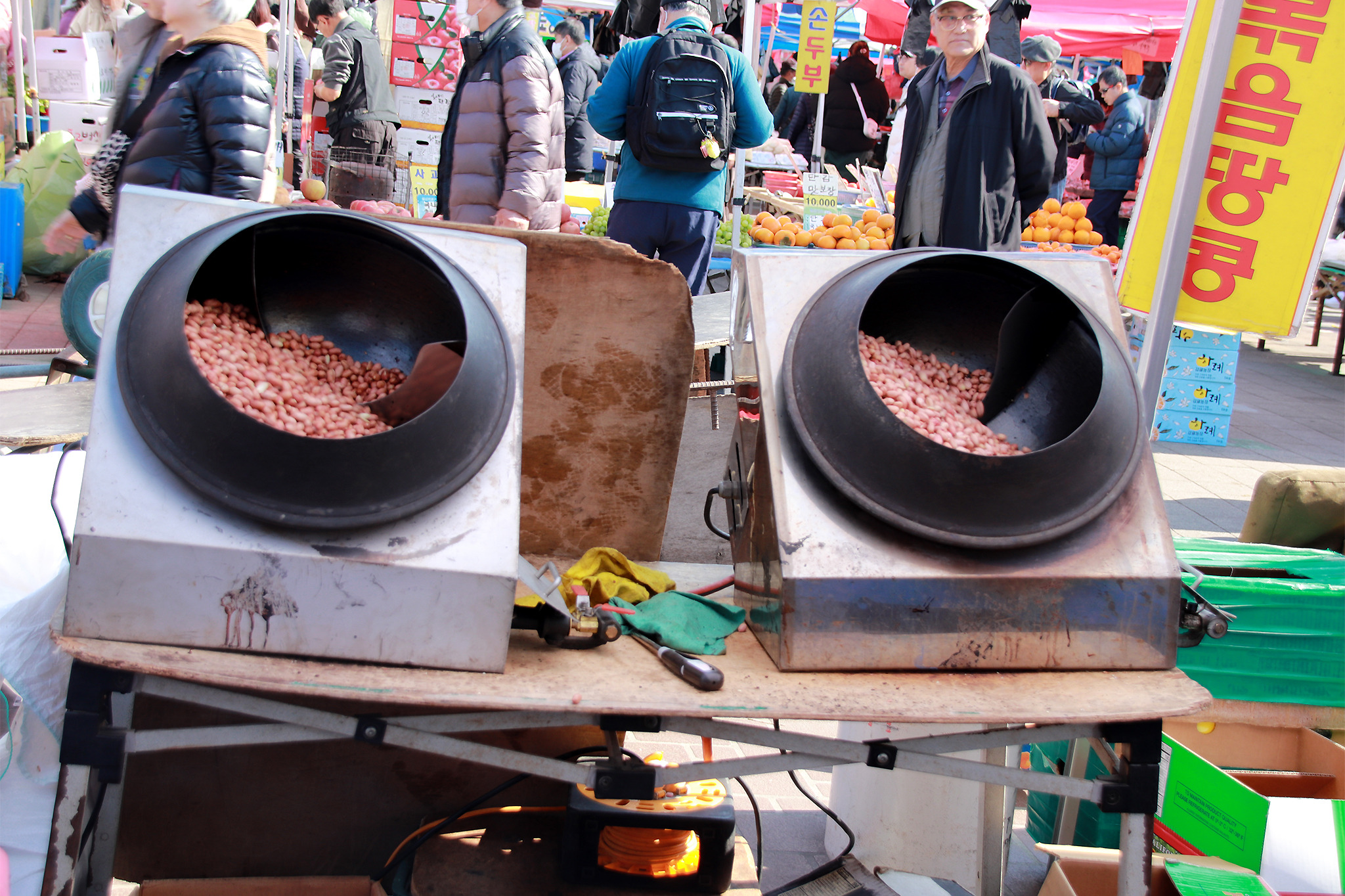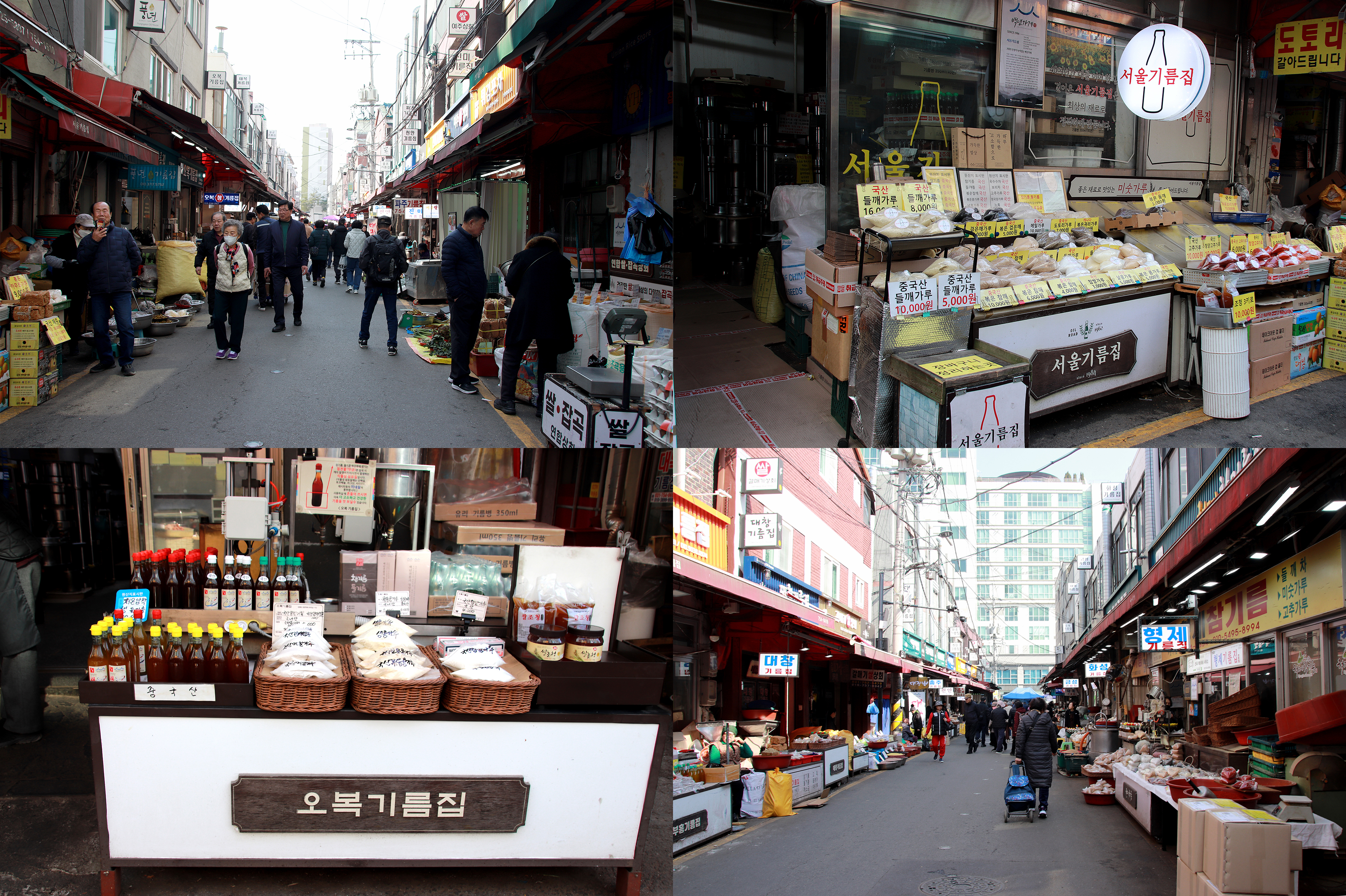 전국 제일의 기름골목으로 오늘은 다소 한산한 것 같으며, 가게마다 직화로 고소하게 볶은 참깨와 들깨, 곱게 빻은 들깻가루가 산처럼 쌓여 있는 것을 볼 수 있다..
