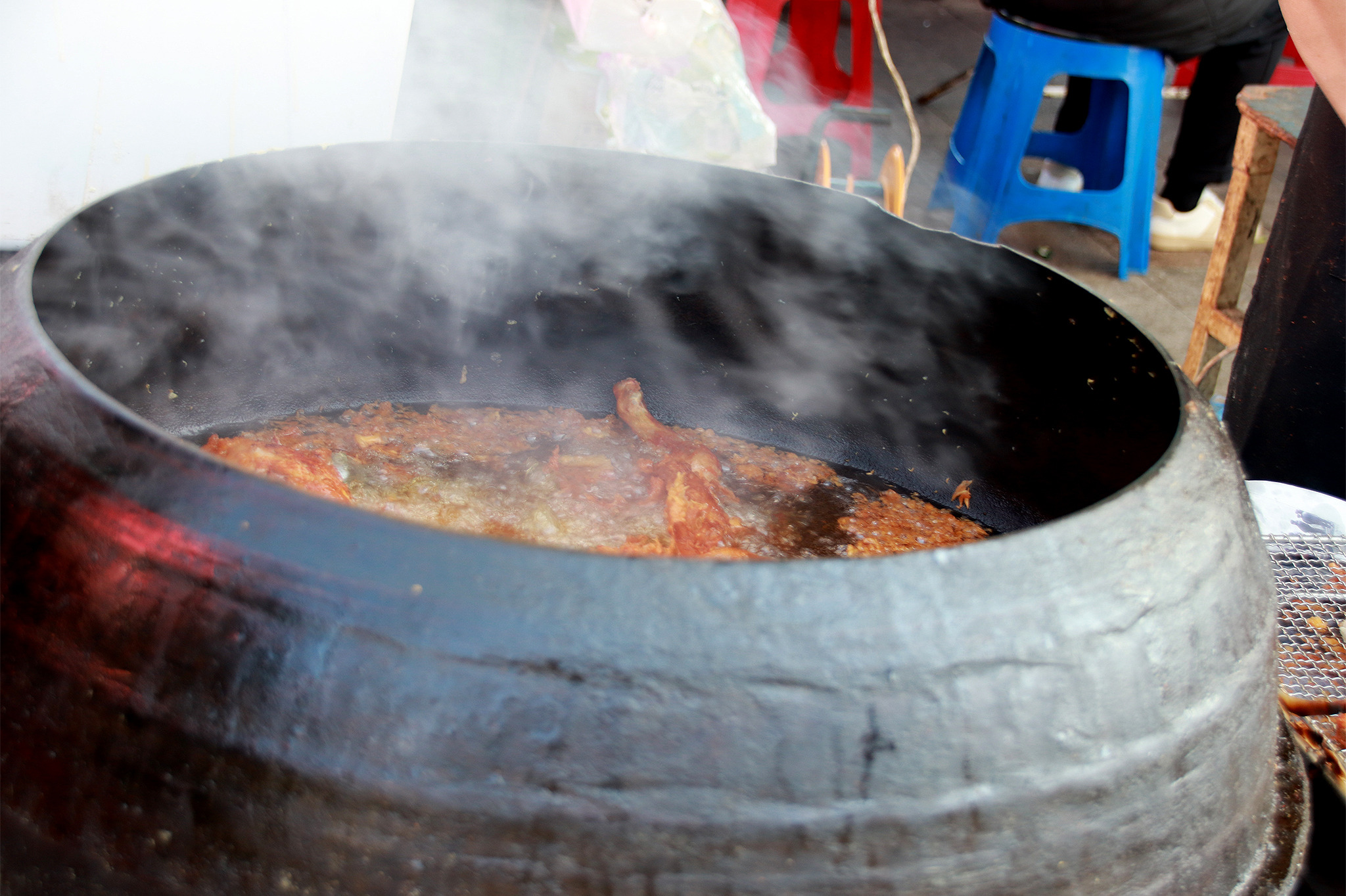 가마솥에서 통닭을 튀기고 있습니다..